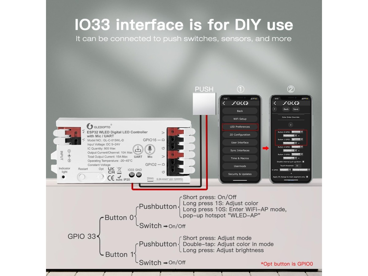 Professional WLED controller with built-in microphone for music-reactive lighting effects. Model: GL-C-015WL-D